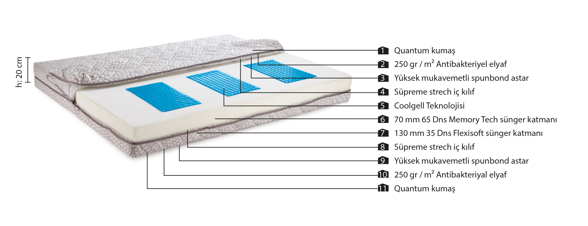 Quantum yatağın jelli versiyonu terleme sorunu olanlar için idealdir. Quantum yataktaki tüm özellikleri de ihtiva eder.