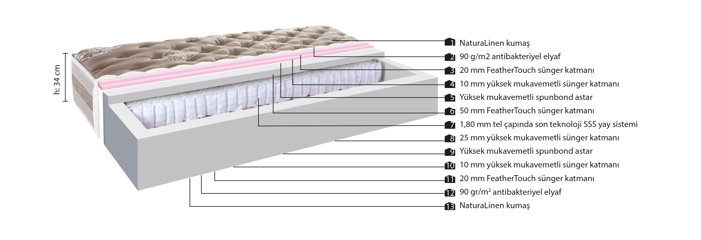 Doğal keten kumaşın yumuşacık dokusu Royalty modelimizde, doğanın insanı ferahlatan nefesine dönüşüyor. Bu yatakta her uyku mutlu sonla bitiyor.